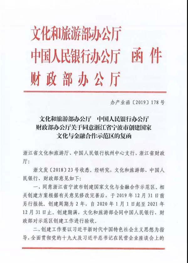 2月10日,文化和旅游部、中國人民銀行、財政部正式批復,同意寧波創(chuàng)建國家文化與金融合作示范區(qū),創(chuàng)建時間從2020年1月至2021年12月。據(jù)“中經(jīng)文化產(chǎn)業(yè)”了解,目前全國僅兩個城市被列為創(chuàng)建國家文化與金融合作示范區(qū),另一個是北京市東城區(qū)。寧波憑什么被列為創(chuàng)建國家文化與金融合作示范區(qū)呢?我們一起來看看。