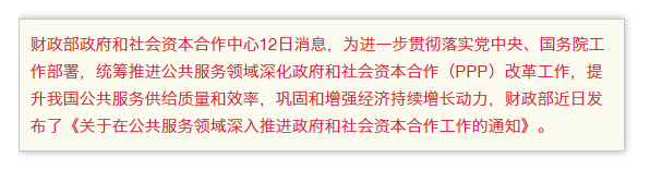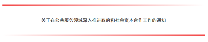 為進(jìn)一步貫徹落實(shí)黨中央、國務(wù)院工作部署,統(tǒng)籌推進(jìn)公共服務(wù)領(lǐng)域深化政府和社會資本合作(PPP)改革工作,提升我國公共服務(wù)供給質(zhì)量和效率,鞏固和增強(qiáng)經(jīng)濟(jì)持續(xù)增長動力,現(xiàn)將有關(guān)事項(xiàng)通知如下: