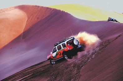 走進(jìn)七星湖景區(qū)之時(shí),正是一輪紅日從一座座沙丘的遠(yuǎn)處緩緩沉落之時(shí),大漠風(fēng)光在記者的眼前徐徐展開。近看,黃沙漫漫,無泥土的沙浪在陽光下閃耀著金色光芒,熱情而奔放;遠(yuǎn)眺,一個(gè)個(gè)金黃色的沙丘此起彼伏,映襯著夕陽晚霞,構(gòu)成了大漠一道靚麗的風(fēng)景線。這時(shí)記者不禁想起了那一首《駝鈴》,多年來,唱響了大江南北,也讓沙漠駝隊(duì)變得更加詩情畫意。進(jìn)入沙漠腹地,無論男女老少,無論是否有駕駛經(jīng)驗(yàn),你都可以登上一輛卡丁車、越野車或摩托車,坐在駕駛員的位置上,只需踩一腳油門,就能盡情的體驗(yàn)沙漠沖浪的驚險(xiǎn)刺激。沙丘連綿不斷,車輛跌宕起伏,猛然沖上高坡,又突然俯沖下來,一車的人在沙漠里興奮的呼喊……