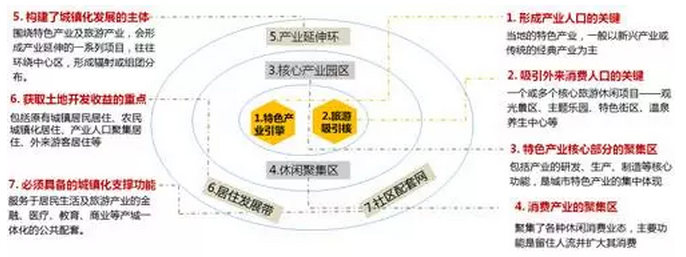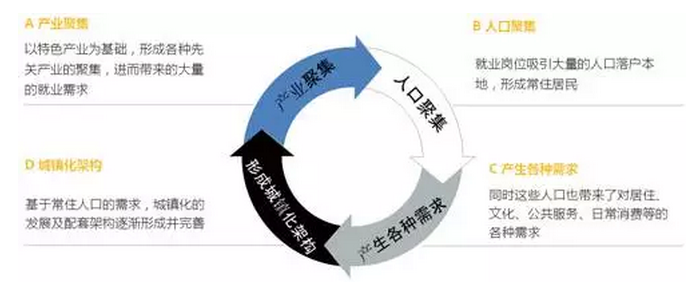 特色產(chǎn)業(yè)的發(fā)展,形成產(chǎn)業(yè)聚集,產(chǎn)業(yè)聚集帶來就業(yè)人口的增加,形成常住居民,常住居民的各種需求,促進地產(chǎn)、金融、公共服務(wù)等配套產(chǎn)業(yè)及設(shè)施的發(fā)展,進而推動城鎮(zhèn)化架構(gòu)的形成。