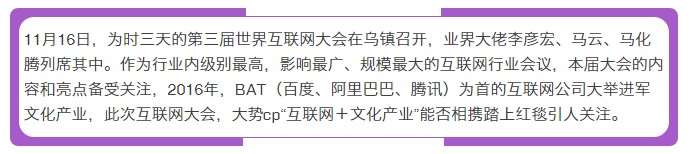 互聯(lián)網(wǎng)消費(fèi)市場已趨于穩(wěn)定與飽和,而對文化資源有充分把控能力的企業(yè)卻有很大探索空間,文化產(chǎn)業(yè)大佬進(jìn)軍互聯(lián)網(wǎng)行業(yè)同時,互聯(lián)網(wǎng)巨頭也在涉足文化產(chǎn)業(yè),提高自己的業(yè)務(wù)范圍和知名度。2016年以來,阿里影業(yè)、百度影業(yè)、騰訊文學(xué)相繼成立。