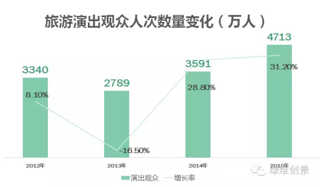 從2013年開始旅游演出的旅游人次逐年遞增,而且從數(shù)據(jù)上可以看出2015年旅游演出的旅游人次增長率遠(yuǎn)高于國內(nèi)旅游人次的額增長率,說明旅游演藝的市場(chǎng)將迎來大發(fā)展,市場(chǎng)需求旺盛。