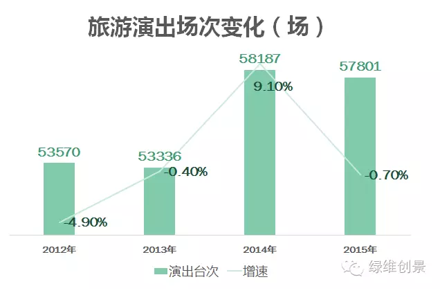 雖然從旅游演藝的規(guī)模和發(fā)展的必要性來看,旅游演藝開發(fā)大熱是必然趨勢(shì)。但是2015年全年旅游演出場(chǎng)次還是略有下滑,較2014年同比下降0.7%。其中新增旅游演出19臺(tái),停演達(dá)46臺(tái)之多,全年旅游演出共計(jì)57801場(chǎng),較2014年減少386場(chǎng),同比下降0.7%。