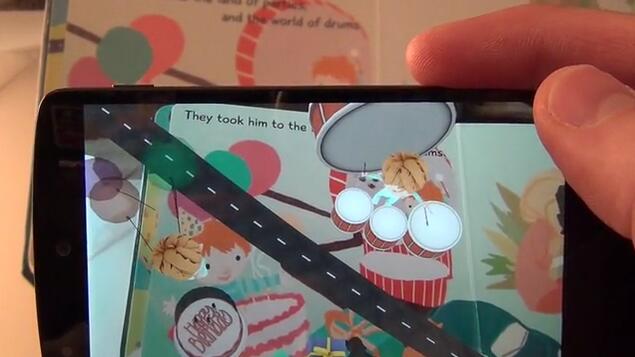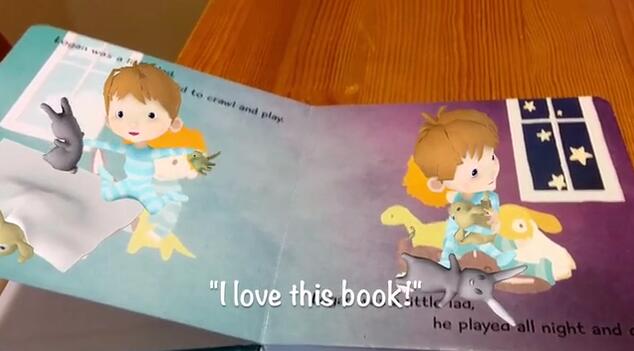 這本插畫書有32頁,只要將其與手機(jī)app配合起來,每頁的小人都可以活靈活現(xiàn)地動(dòng)起來。例如書上的靜態(tài)插畫是小男孩哄玩具兔子睡覺,打開手機(jī)app,對(duì)準(zhǔn)插畫,屏幕里的小男孩就“活”了,他會(huì)輕搖并輕拍玩具兔子,怎一個(gè)可愛了得。