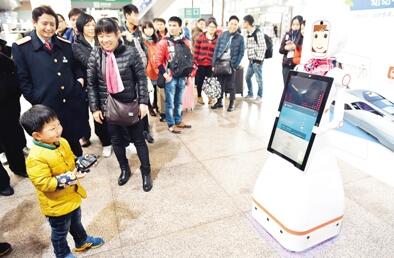 2月1日,一臺(tái)名叫“小璐”的智能機(jī)器人亮相廣州南站,吸引了大批旅客的圍觀,大家紛紛嘗試與“小璐”對(duì)話,向她咨詢列車時(shí)刻、購票信息、天氣情況等問題,“小璐”不僅可以用甜美的女聲一一作答,還可以在接收到語音指令后,為旅客“唱歌”和“跳舞”。據(jù)了解,使用智能機(jī)器人服務(wù)旅客是廣州南站在今年春運(yùn)中的新嘗試,如果試用效果良好,今后有望在車站中看到更多智能機(jī)器人的身影。圖為一位小朋友嘗試與智能機(jī)器人“小璐”對(duì)話。