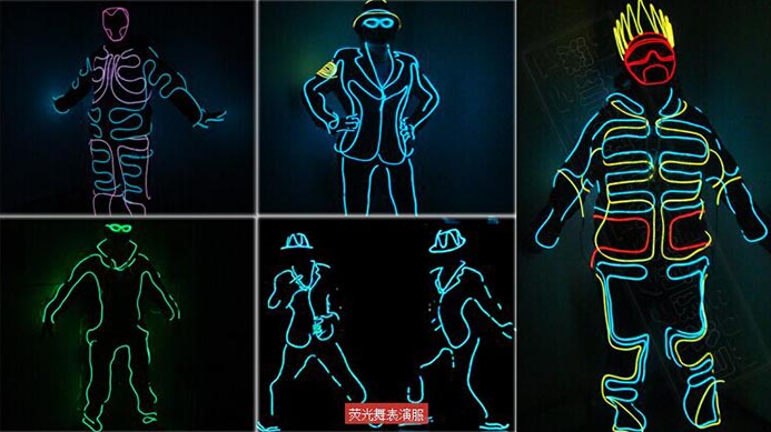 熒光舞,起源于歐美國家的派對,在派對中人們利用各種熒光道具來裝點活動氣氛,隨著不斷發(fā)展,熒光舞吸收了各種舞蹈所長,在滿足視覺上美感的同時,也能帶來精神上的愉悅,觀賞熒光舞,無疑是種美的享受。熒光舞服就是表演這種創(chuàng)意舞蹈的基本道具,它主要利用一種發(fā)光材質(zhì)“ET冷光線”,把燈線縫制或黏貼到衣服上,裝上電池即可使用。