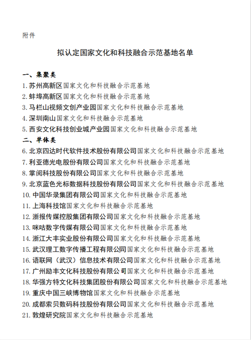 按照《國(guó)家文化和科技融合示范基地認(rèn)定管理辦法(試行)》(國(guó)科發(fā)高〔2018〕72號(hào))、《科技部辦公廳、中宣部文改辦關(guān)于開(kāi)展2018年國(guó)家文化和科技融合示范基地申報(bào)工作的通知》(國(guó)科辦高〔2018〕17號(hào))要求,科技部、中宣部會(huì)同中央網(wǎng)信辦、文化和旅游部、廣電總局啟動(dòng)了國(guó)家文化和科技融合示范基地認(rèn)定工作。經(jīng)合規(guī)性審核、專家函評(píng)、會(huì)議答辯、調(diào)研實(shí)勘、部門商議等環(huán)節(jié),確定了21家擬認(rèn)定基地名單。現(xiàn)予以公示,公示期2019年3月15日-3月21日(5個(gè)工作日)。